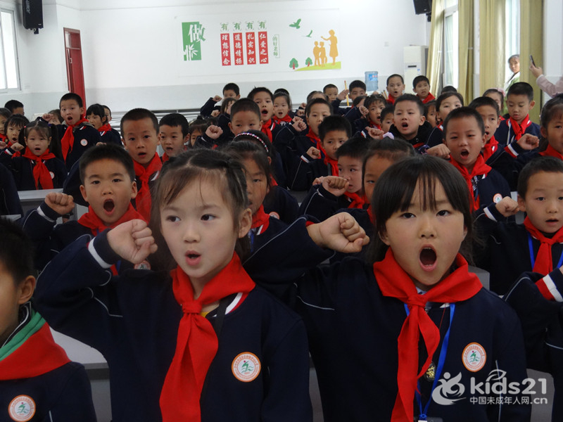 “我们是共产主义接班人,继承革命先辈的光荣传统,爱祖国,爱人民,鲜艳的红领巾飘扬在前胸……”活动在师生齐唱《中国少年先锋队队歌》的歌声中拉开帷幕。在大队辅导员宣布新队员名单后,五年级的少先队员为新队员佩戴鲜艳的红领巾,并在大队长秦瑞雪的带领下,新队员们面对少先队队旗进行了庄严的入队宣誓,老队员重温入队誓词,这标志着103名新生加入了中国少年先锋队组织,成为了光荣的少先队员。