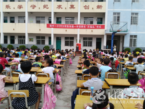 未成年人网广西讯(小记者 陆沐君)9月1日,昭平一小迎来了380名一年级的新生,进入小学学习,这是他们人生的一件大事,是学习的开始,9月9日在昭平一小大操场召开一年级新生“开笔礼”。8点30分,所有一年级的新生背着书包,端端正正地坐在自己的位置上,用热烈的掌声迎来“开笔礼”,首先是黄校长讲话,她欢迎并祝贺一年级的新同学正式成为昭平一小的学生,祝愿这些小弟弟、小妹妹们在学校度过他们美好、难忘、快乐的童年!接着蓝主任教新生正衣冠、学校领导和部分家长帮新生点朱砂启智、击鼓鸣志、启蒙描红、茶敬长辈恩师、派送红蛋,最后校长亲自给新生赠送图书,让小弟弟、小妹妹们养成阅读的好习惯。