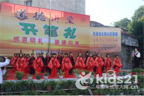 本次“开笔礼”仪式包括:“端正衣冠”、“开启人生”、“朱砂启智”、“击鼓鸣志”、“启蒙描红”、“赠书励志”和“礼谢亲师”等环节。
