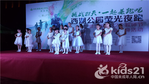 作为此次活动协办方的博才西湖小学,精心组织学生进行排练、表演歌舞《感恩的心》,为教师节倾情献礼。孩子们稚嫩清脆的歌声,响彻广场,让每一位在场的教师和群众为之动容。接着,孩子们为优秀教师代表献上了美丽的鲜花和节日的祝福。最后,博才西湖小学的周校长,带领教师积极参与荧光夜跑活动,并勇获教师男子组第一名,将全体师生的热情推向高潮。