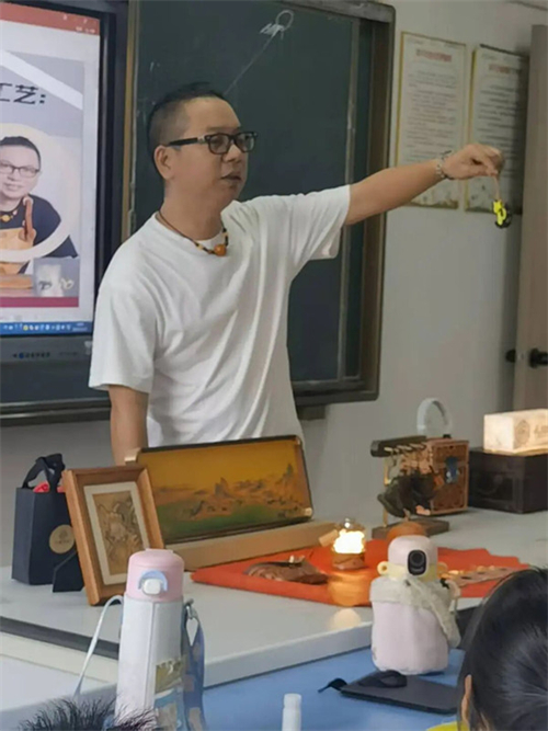 作为深耕皮艺二十余年的匠人,徐老师早已将校园传承视为重要使命。他不仅在多所高校开设课程,更致力于让非遗贴近青少年生活,此次特意简化工序、设计适合儿童的教学内容。“非遗传承不能只靠情怀,进校园是最直接的方式。”徐世杰看着孩子们的作品感慨道,“希望这些小小的挂件能在他们心里种下匠心的种子,让温州皮艺后继有人。”