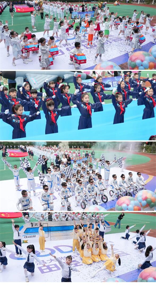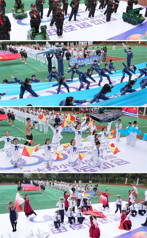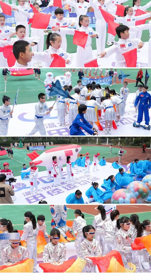 开幕式上,国旗护卫队英姿飒爽,步伐整齐有力,尽显附小学子的活力与对祖国的赤诚;校旗与运动会会旗迎风飘扬,不仅寓意运动的激情与梦想,更彰显“智圆慧行・知行合一”的校园理念。六年级方阵以“智探星河・逐梦宇宙”为核心主题,将对航天科技的无限探索欲融入创意展示。从5G信号的速度、AI交互的温度,到模拟蛟龙潜艇深海勘探的无畏,再到承载航天精神的昂扬姿态,以及化身星河追梦者诠释太空探索精神的活力表现,全方位展现少年对宇宙奥秘的向往与科技探索的热情。
