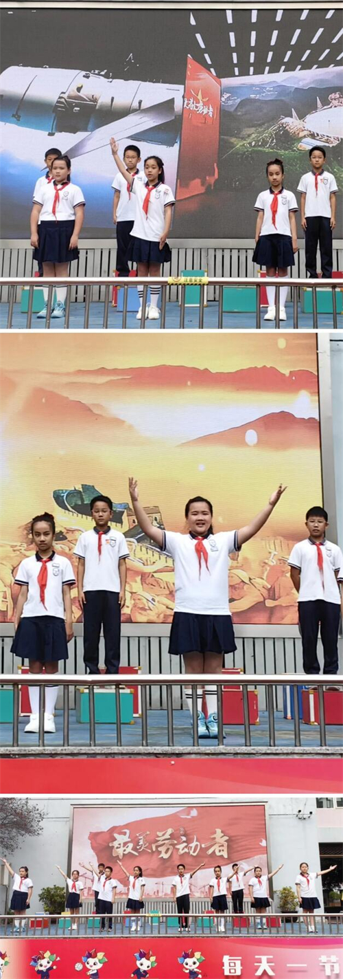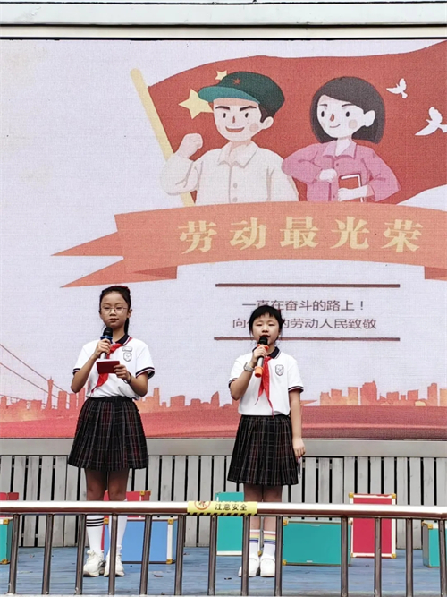 晨会伊始,主持人李珞冉和沈可心以热情洋溢的开场白,精准点明了劳动对于生活和成长的重要意义,瞬间点燃了现场的氛围。随后,庄重的出旗仪式正式开始,伴随着激昂的乐曲声,护旗手们迈着整齐划一的步伐入场。全体师生肃立注目,升国旗、奏唱国歌,少先队员们行队礼,浓浓的爱国情怀与对劳动的崇高敬意在校园中久久回荡。