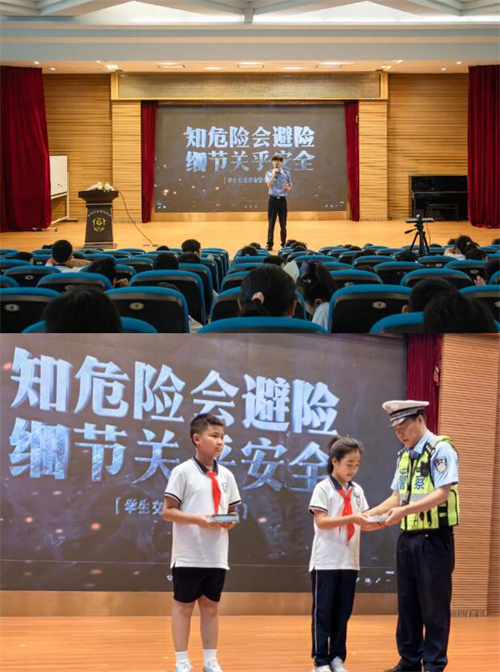 报告厅里,灯光一暗,大屏亮起——《知危险会避险,细节关乎安全——学生交通安全警示录》警示录正式“上线”。闯红灯的惊险刹那、鬼探头的突发状况……真实画面引得现场尖叫声此起彼伏。影片结束,张警员趁热打铁,抛出“校门口三道关”安全提醒: