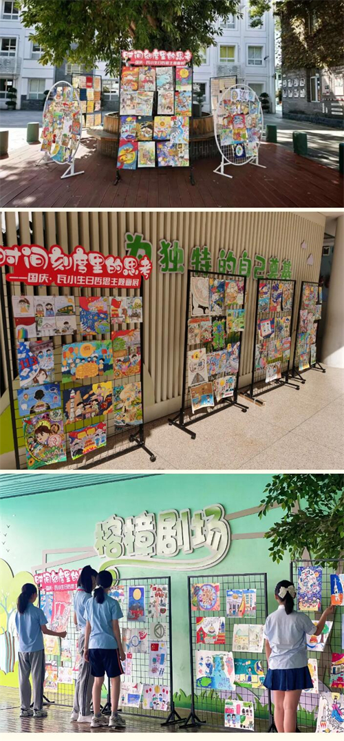 金秋双节,家国同庆。2025年国庆中秋假期期间,温州市瓦市小学以“时间刻度里的思考”为主题,精心策划了一场贯穿“国庆・华夏时光”“中秋・团圆时光”“生日・瓦小时光”三大维度的哲思画征集活动。作为学校德育工作的重要实践,本次活动鼓励孩子们以画笔为媒,在斑斓色彩与奇趣构图中追问时间的意义,四个校区同步举办的画展更是成为假期后校园里最动人的风景线。