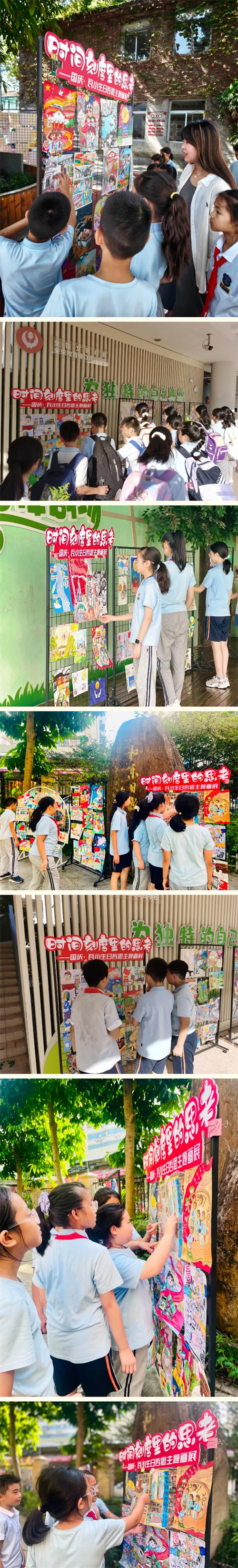 假期结束后,瓦市、江滨、中山、育英四个校区同步开启哲思画展。展览期间,孩子们时而驻足讨论画作细节,时而在留言墙上写下自己的思考:“时间是爷爷眼角的皱纹,也是我长高的身高线”“时间让中秋的月亮更圆,让瓦小的榕树更盛”……真挚的感悟与灵动的画作相映成趣。