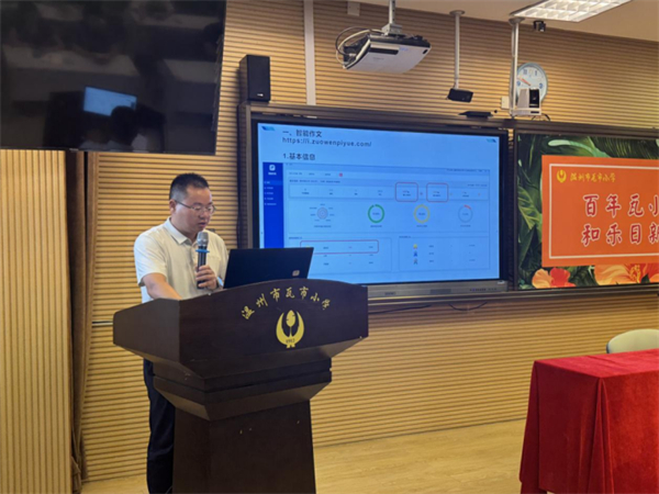 紧接着,教导主任叶柏青老师以《AI教学平台矩阵赋能小学教育》为题,结合数学“洋葱学园”、语文智能作文批改、AI录课系统、希沃魔方等具体平台,生动展示了我校构建的多元化、实效性AI教学平台如何深度赋能各学科教学,实现精准教研与个性化学习,让学员们对技术如何切实服务于教学有了更直观的认识。