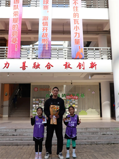 更让小球员们兴奋的是,浙ba篮球赛温州联队队长、瓦市小学知名校友杨希龙亲临现场。作为从瓦市小学走出的优秀学子,杨希龙带着对母校的深厚情怀重返校园,他不仅为赛事送上真挚祝福,还走到球员中间,与小球员们展开趣味互动,与小粉丝合影留念。王冰校长代表学校向杨希龙赠送了一幅学生创作的哲思国画。画作以 “攀登” 为核心意象,笔墨间饱含着母校对校友的殷切期许,也凝聚着学弟学妹们对榜样的崇敬之情。