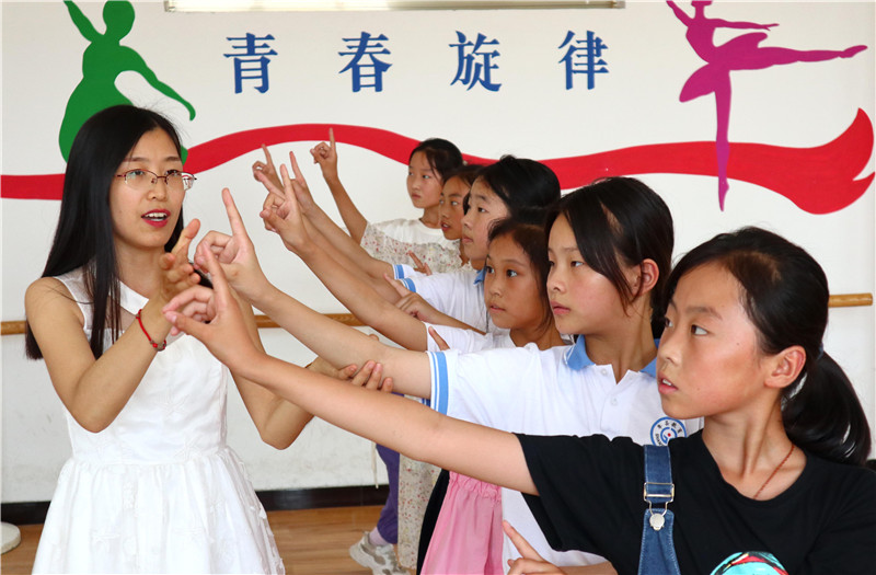 6月16日,在山东省单县黄岗镇乡村“复兴少年宫”的舞蹈活动室,少年宫辅导员崔静在指导孩子们练习舞蹈。新华社记者 徐速绘 摄