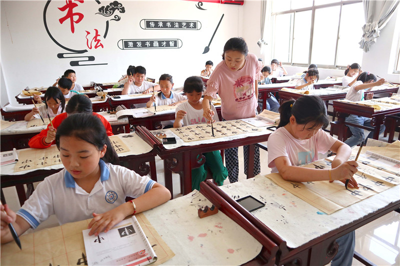 6月16日,在山东省单县黄岗镇乡村“复兴少年宫”的书法活动室,少年宫辅导员朱乙斐在指导孩子们学习写毛笔字。新华社记者 徐速绘 摄