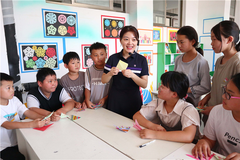 6月16日,在山东省单县黄岗镇乡村“复兴少年宫”的美术活动室,少年宫辅导员谢天予(中)在指导孩子们制作折纸作品。新华社记者 徐速绘 摄