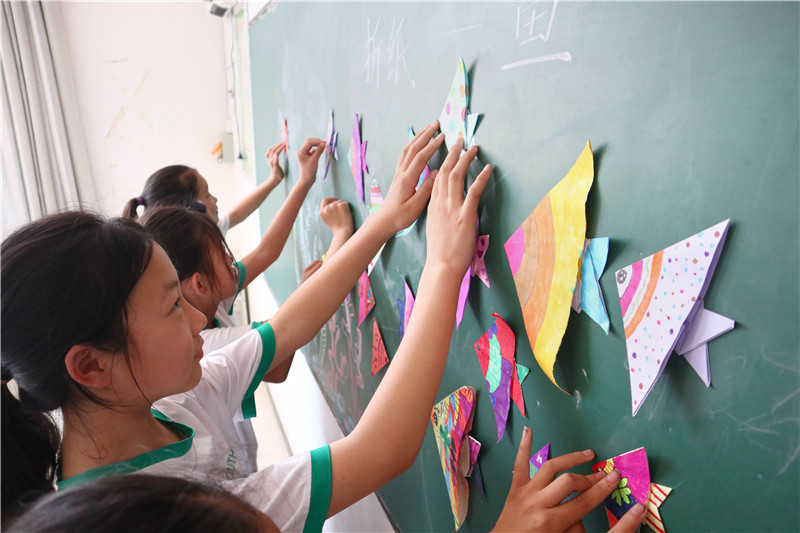 6月16日,在山东省单县黄岗镇乡村“复兴少年宫”的美术活动室,孩子们把制作的折纸作品粘贴起来。新华社记者 徐速绘 摄