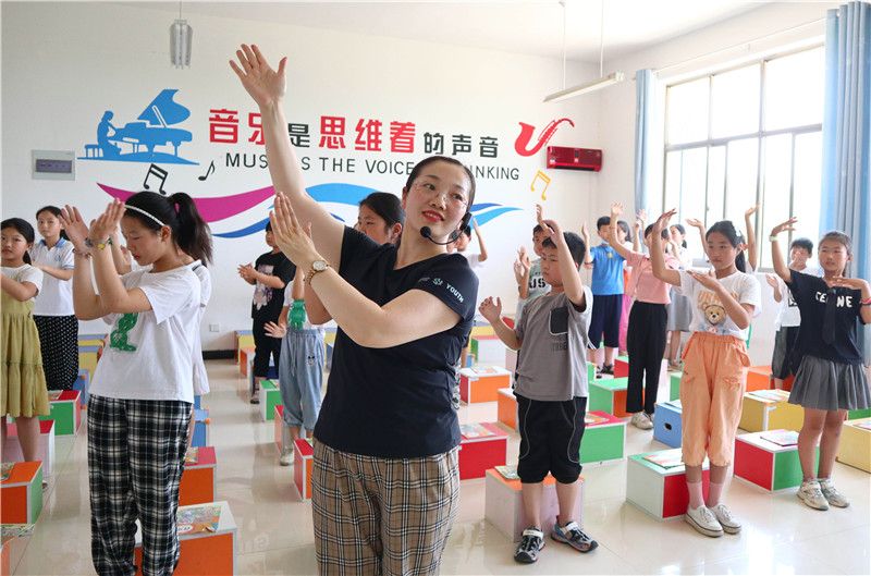 6月16日,在山东省单县黄岗镇乡村“复兴少年宫”的音乐活动室,少年宫辅导员郑莉丽在带领孩子们做音乐韵律操。新华社记者 徐速绘 摄